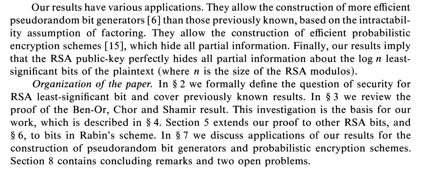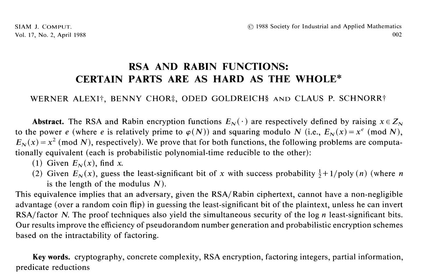 Alexi, W., Chor, B., Goldreich, O., & Schnorr, C. P. (1988). RSA and Rabin functions: Certain parts are as hard as the whole. SIAM Journal on Computing, *17*(2), 194-209. https://doi.org/10.1137/0217013