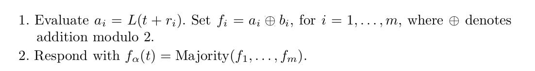 The algorithm is pretty simple: query our function at certain (independent) points and return the majority bits.