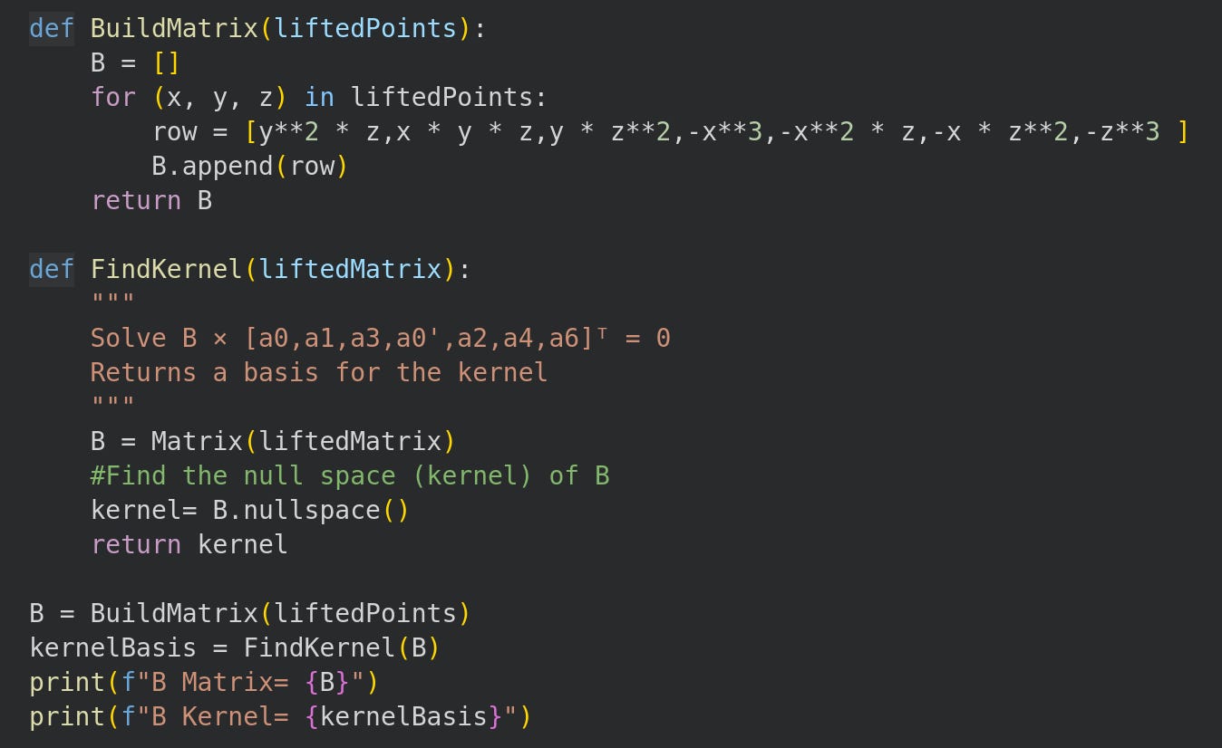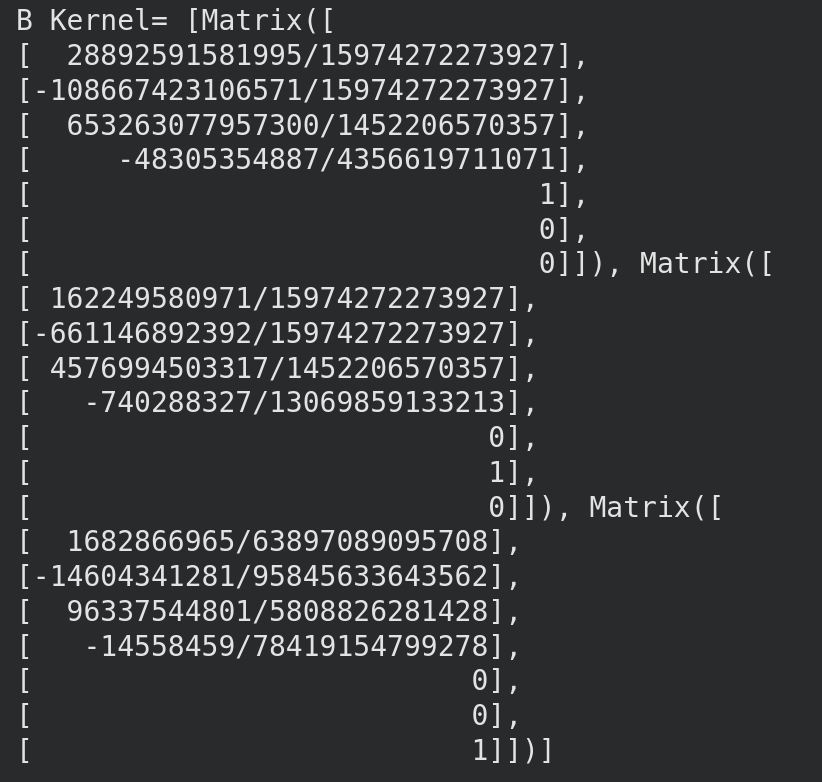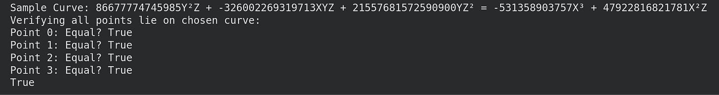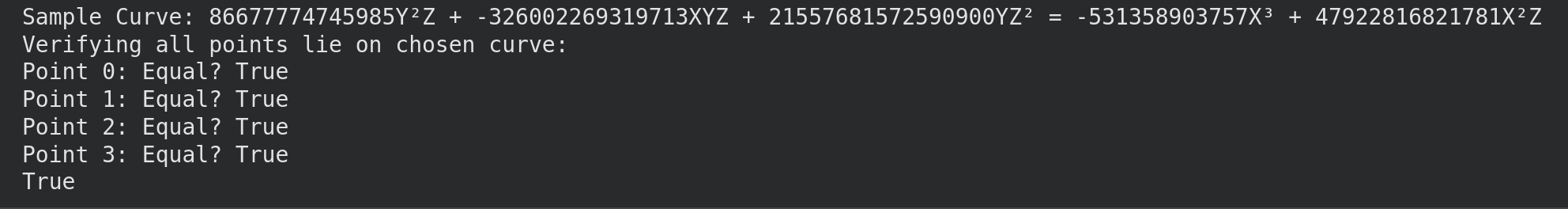 Any linear combination of the kernel basis vectors from Step 7 yields a valid elliptic curve that passes through our lifted points.