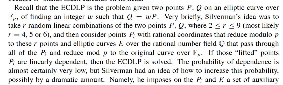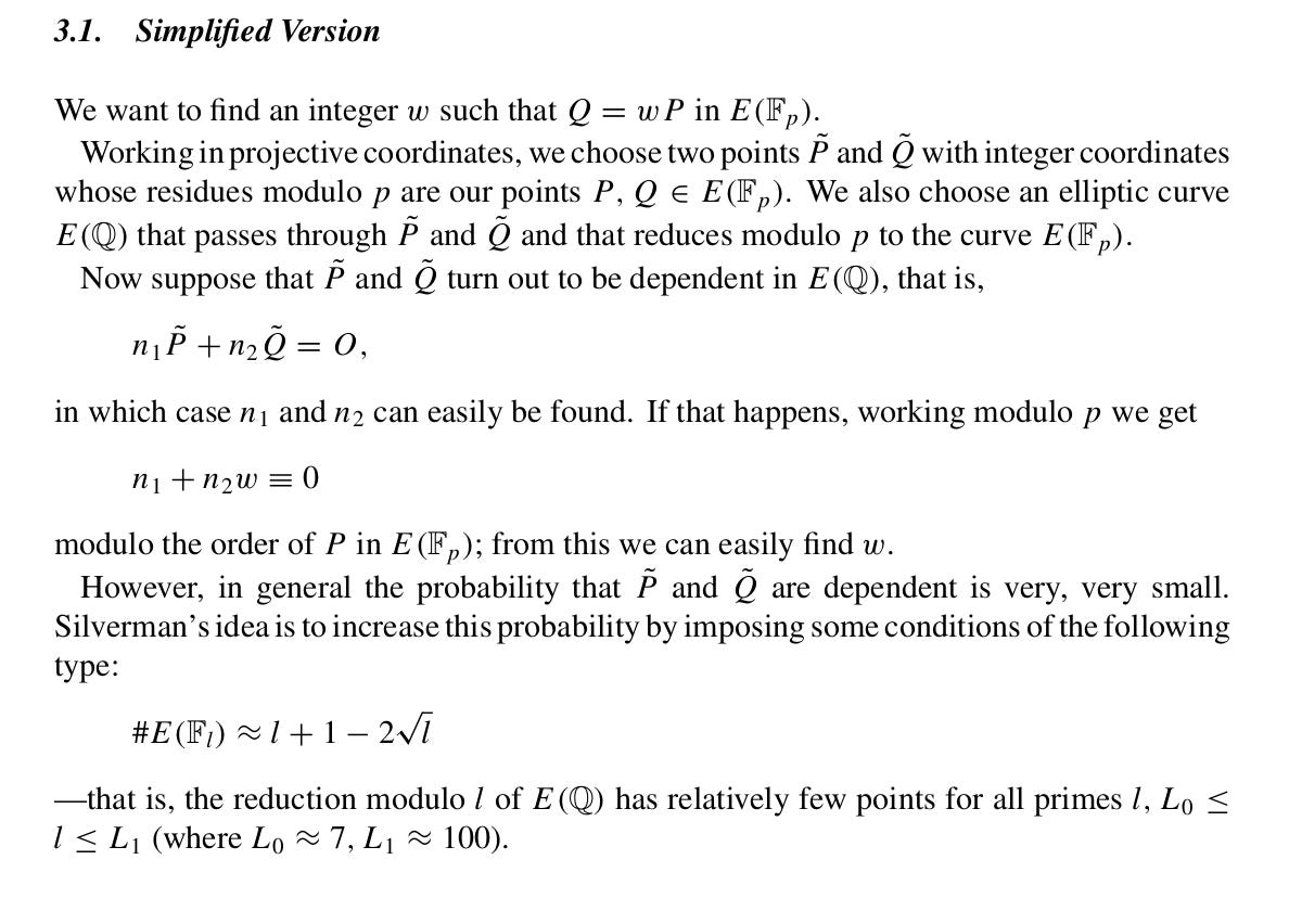 More formally, Silverman’s idea (Silverman, 2000)2 was to take r random linear combinations of the two points, P and Q, and find rational points that pass through all of the linear combinations and reduce mod p to the original curve (Jacobson et al., 2000).