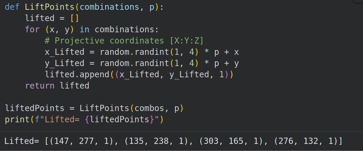 In our case, we set z to 1 for simplicity. Then we merely add random multiples of p=67 to the x and y coordinates.