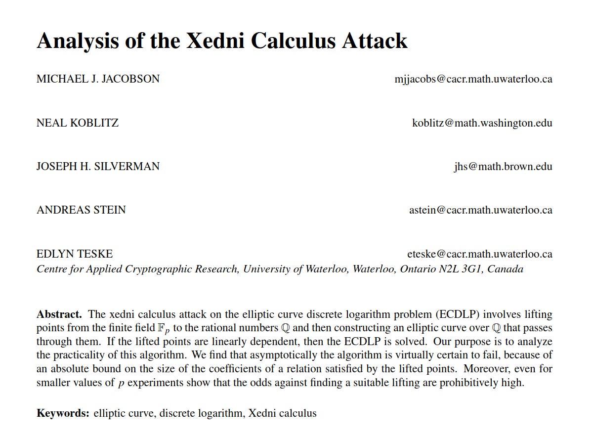 Jacobson, M. J., Koblitz, N., Silverman, J. H., Stein, A., & Teske, E. (2000). Analysis of the xedni calculus attack. Designs, Codes and Cryptography, 20(1), 41–64. PDF Link.