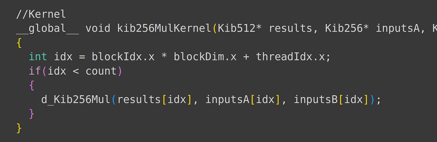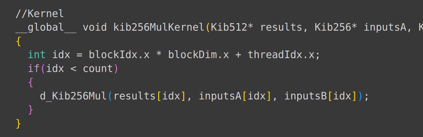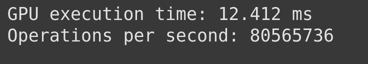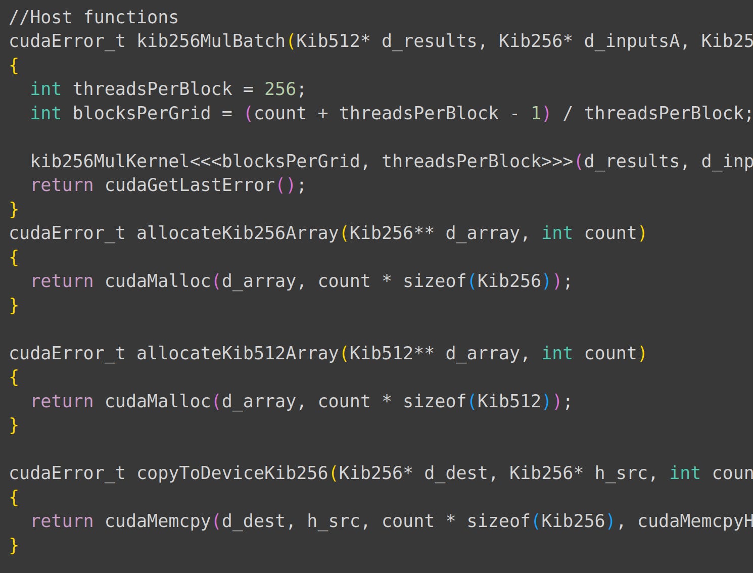 Our 256 bit integer GPU code took 12 milliseconds to perform as many multiplications as our CPU code.
