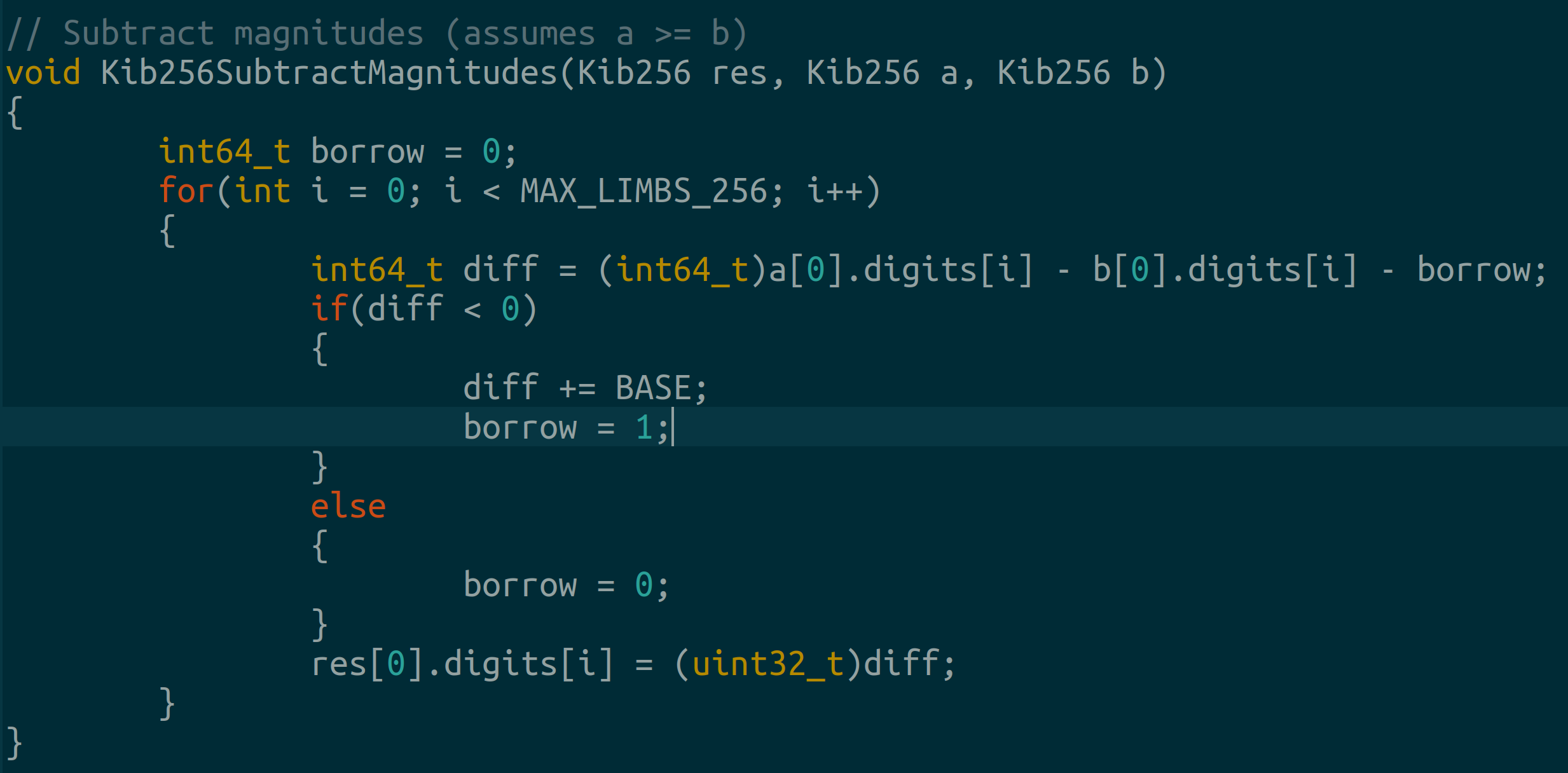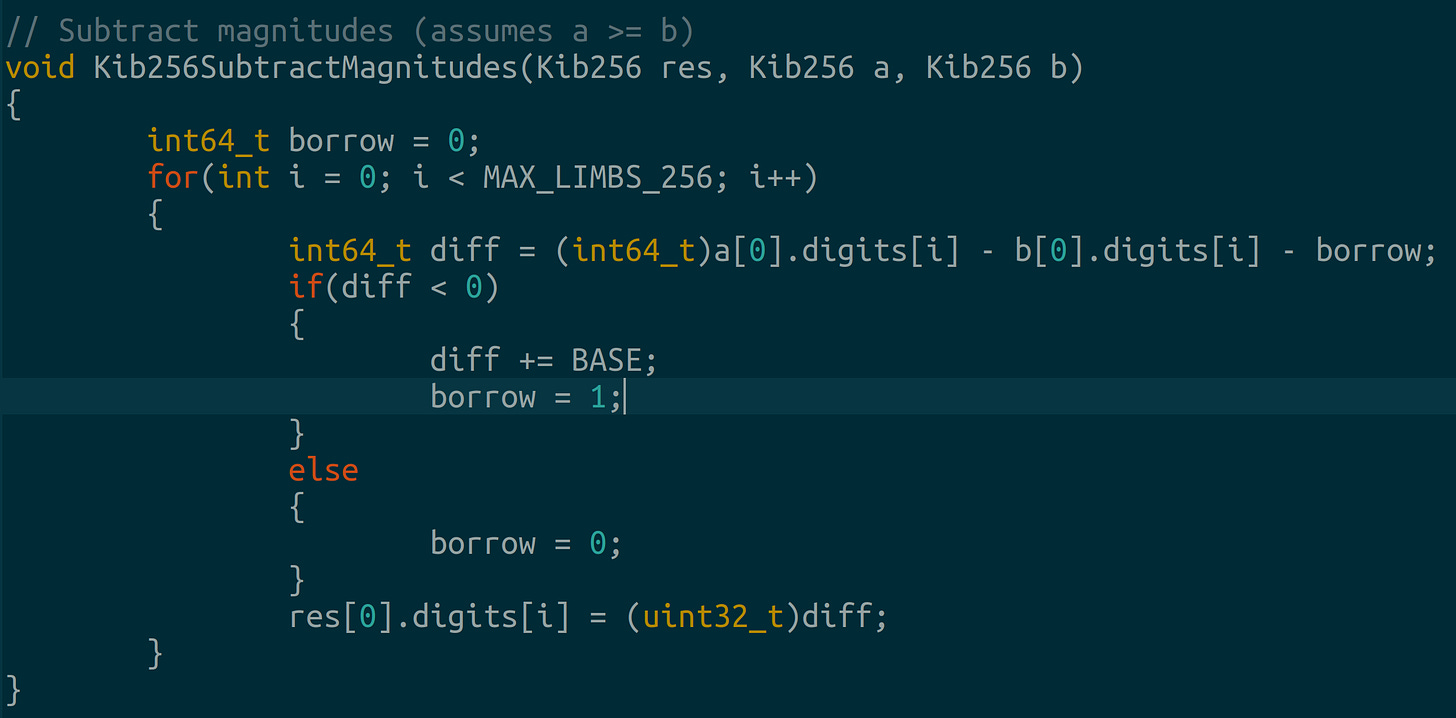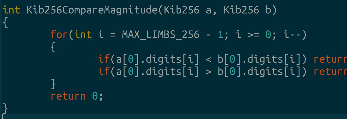 First we write an absolute value comparison function. It ignores the sign and compares from the largest bit to the smallest bit limb.