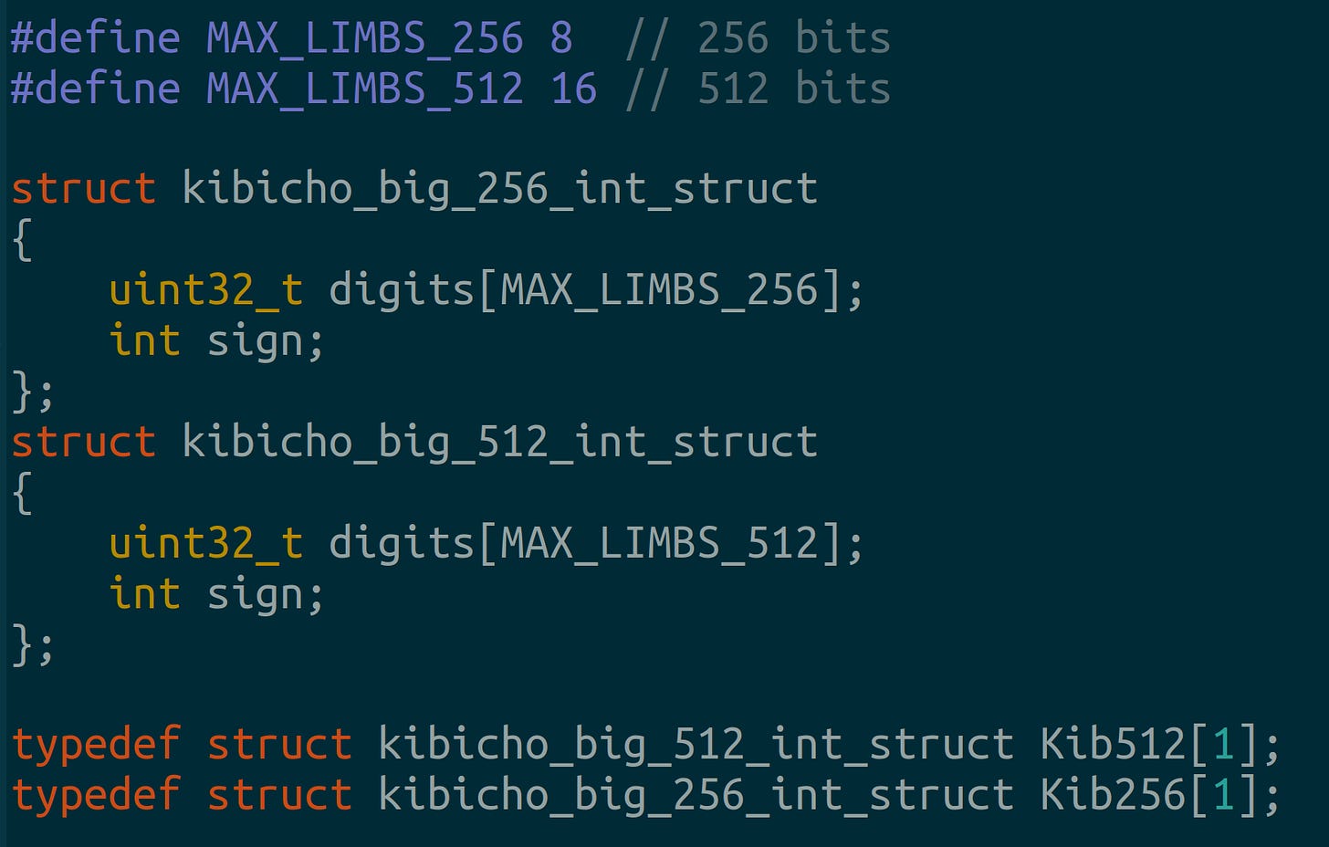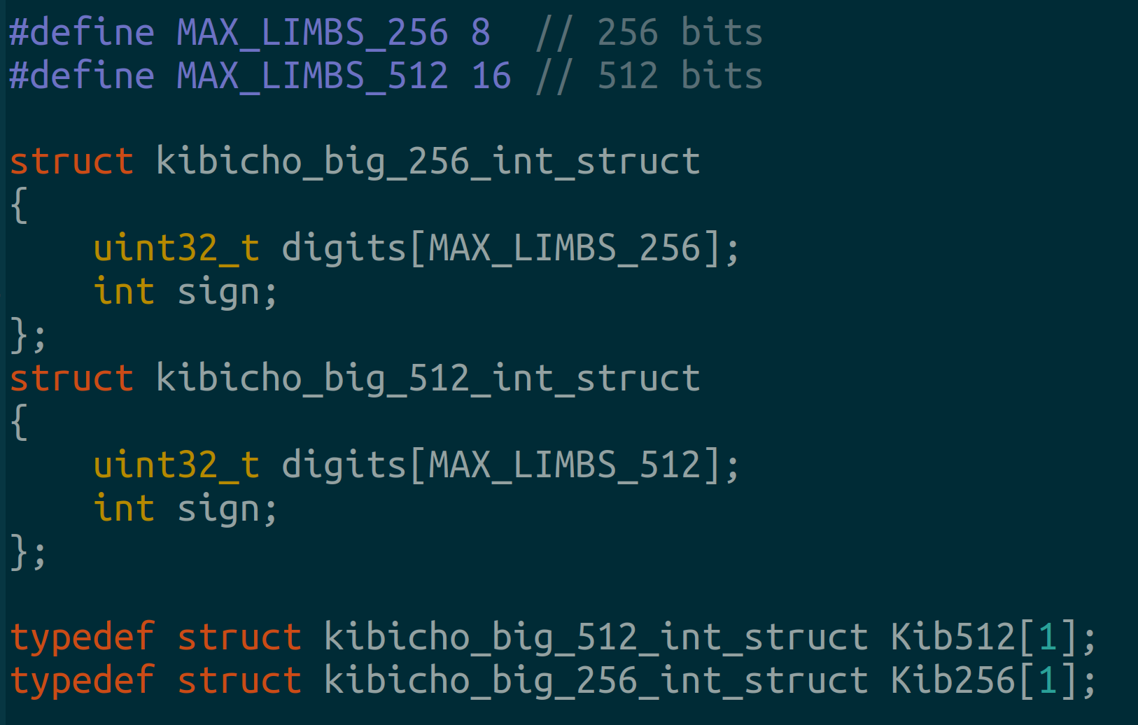 We store our integers in limbs. Our example uses unsigned 32 bit integer arrays. These are 8 limbs for 256 bit arithmetic and 16 limbs for 512 bit arithmetic.