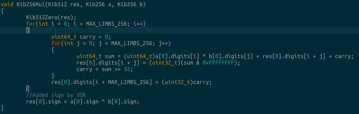 We implement usual grade school multiplication. Nothing fancy. Observe that we store our multiplication result in a 512 bit data type.