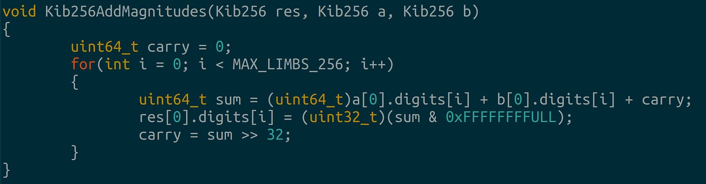 Then we write a pretty simple addition function that carries in an unsigned 64 bit data type.