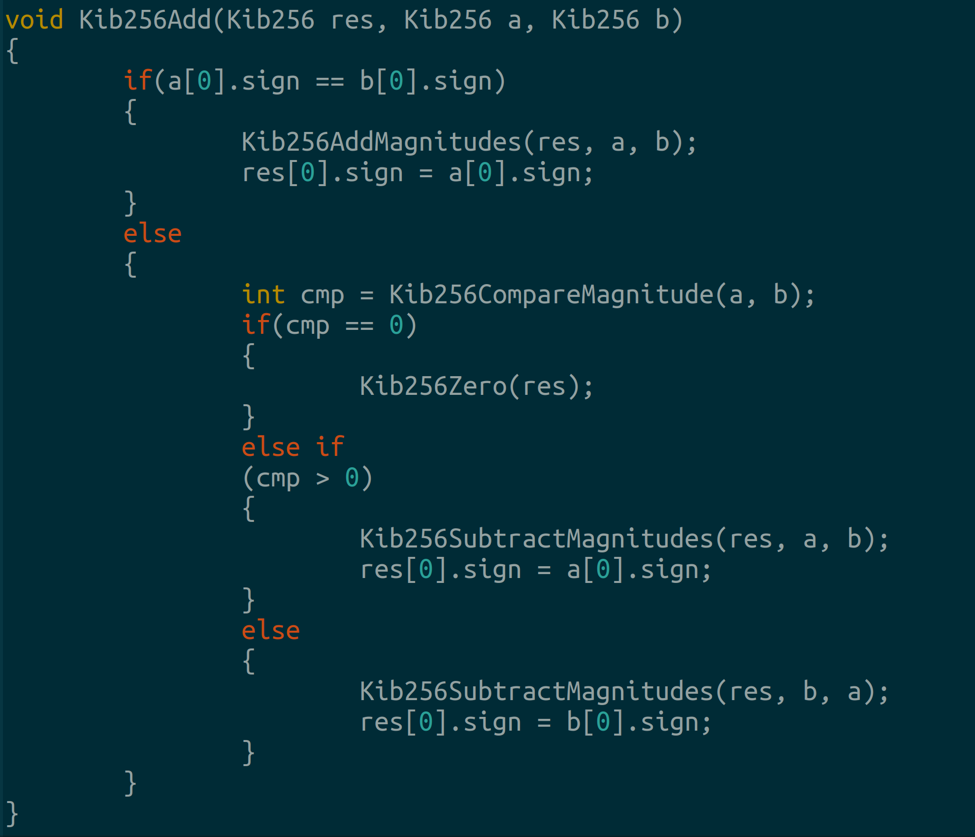 We implement signed addition by perfoming magnitude tests. We start from the most significant limb and add towards the least significant limb. We use 64 bit unsigned integers to handle carries.