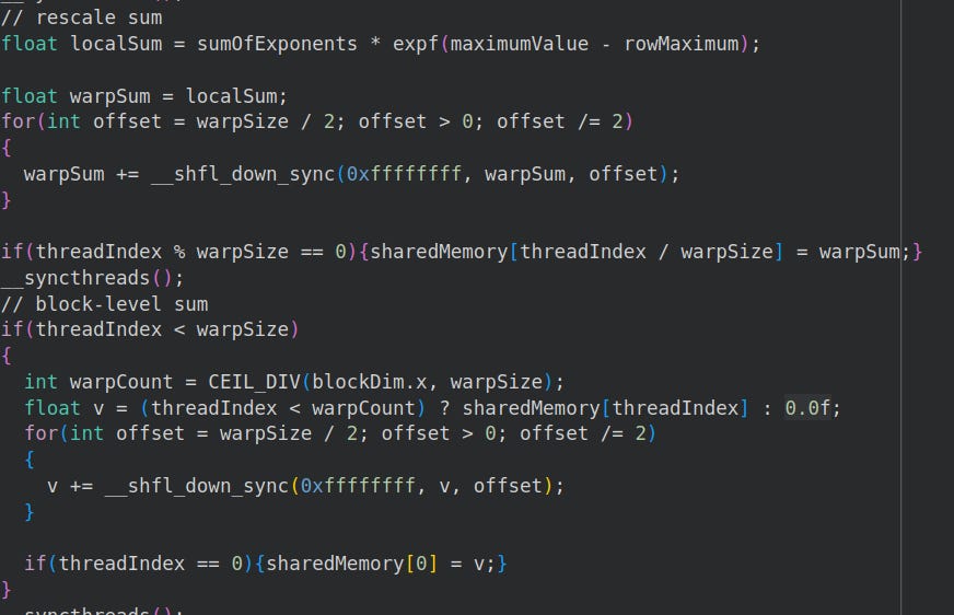 Now we need to find the max and sum in the current warp (group of matrix columns).