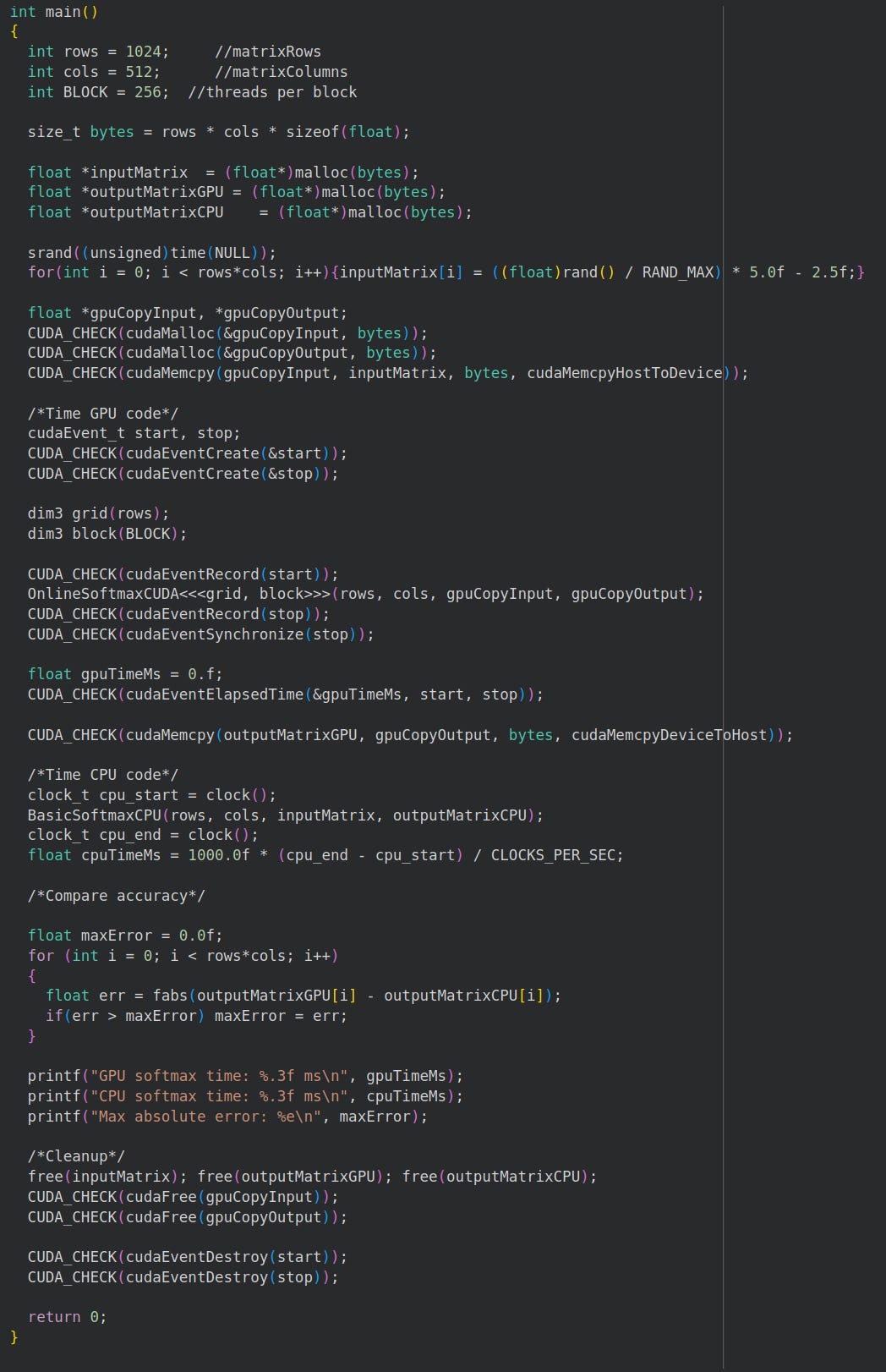 Next, we’ll write our main function. It’s a lot of CUDA boilerplate tbh.