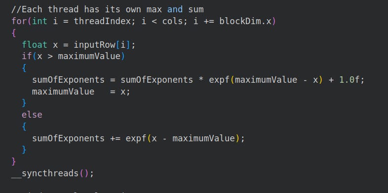 Our goal is to have each block of GPU threads process a single softmax array, and the threads within each block process small chunks of the array (Maharshi, 2025)4.