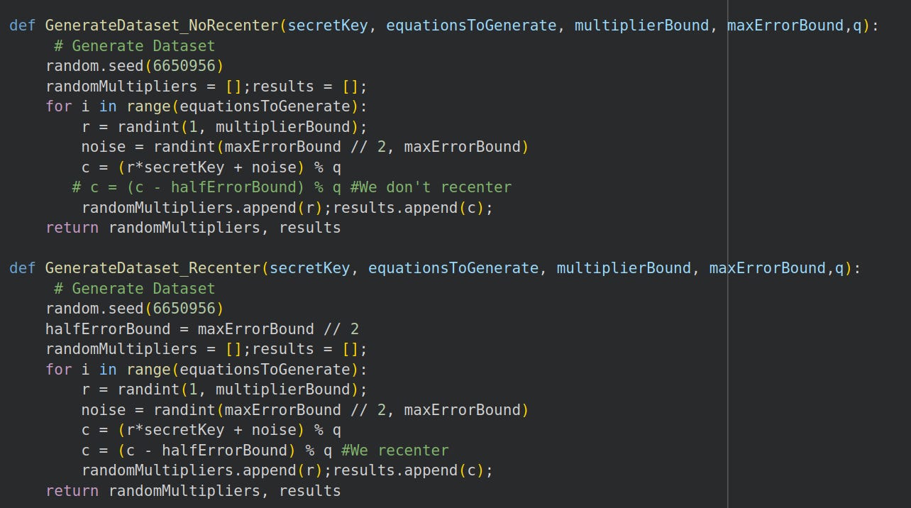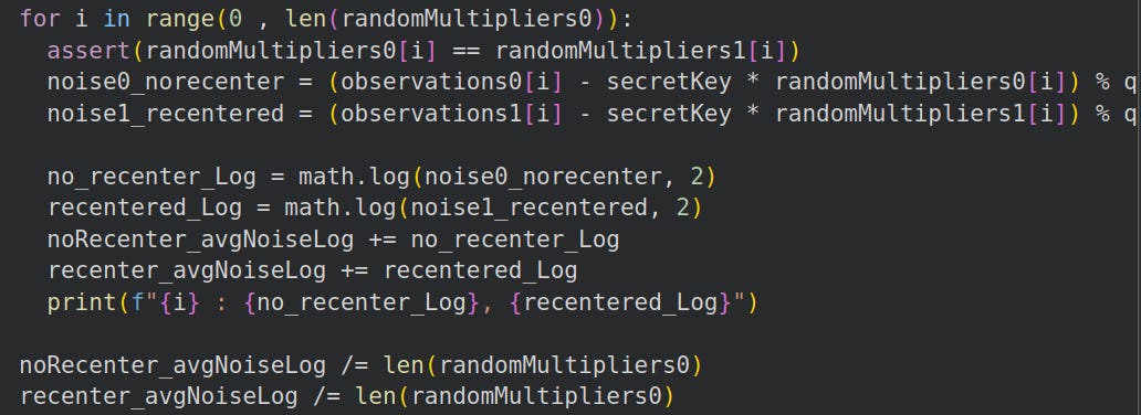 noise = (observation - secretKey * multiplier) % qSo we can compare the noise term for the identical datasets in a for loop: