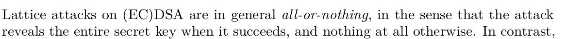 The paper, Guessing Bits: Improved Lattice Attacks on(EC)DSA with Nonce Leakage (Sun et al., 2021)2, improves on the (Albrecht & Heninger, 2020)3 lattice-based HNP by: