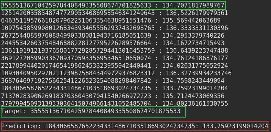 Ultimately, our prediction logic will FAIL. However, observe that our desired target appears in the generated list of possible alphas (it’s just not the smallest anymore)