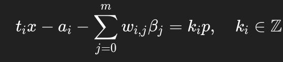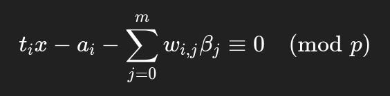 (Boneh & Venkatesan, 1996)2 introduce the linear hidden number problem and assert that lattice reduction recovers the unknown key (x) in polynomial time despite the noise term (βi) when provided known multipliers (ti) alongside known observations (ai).