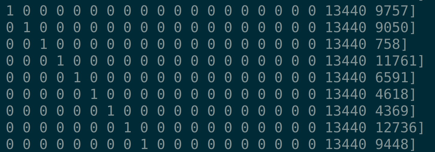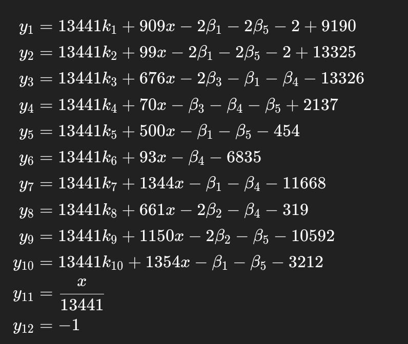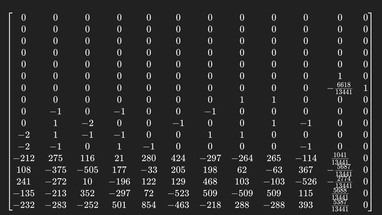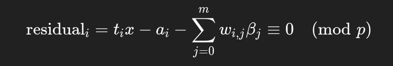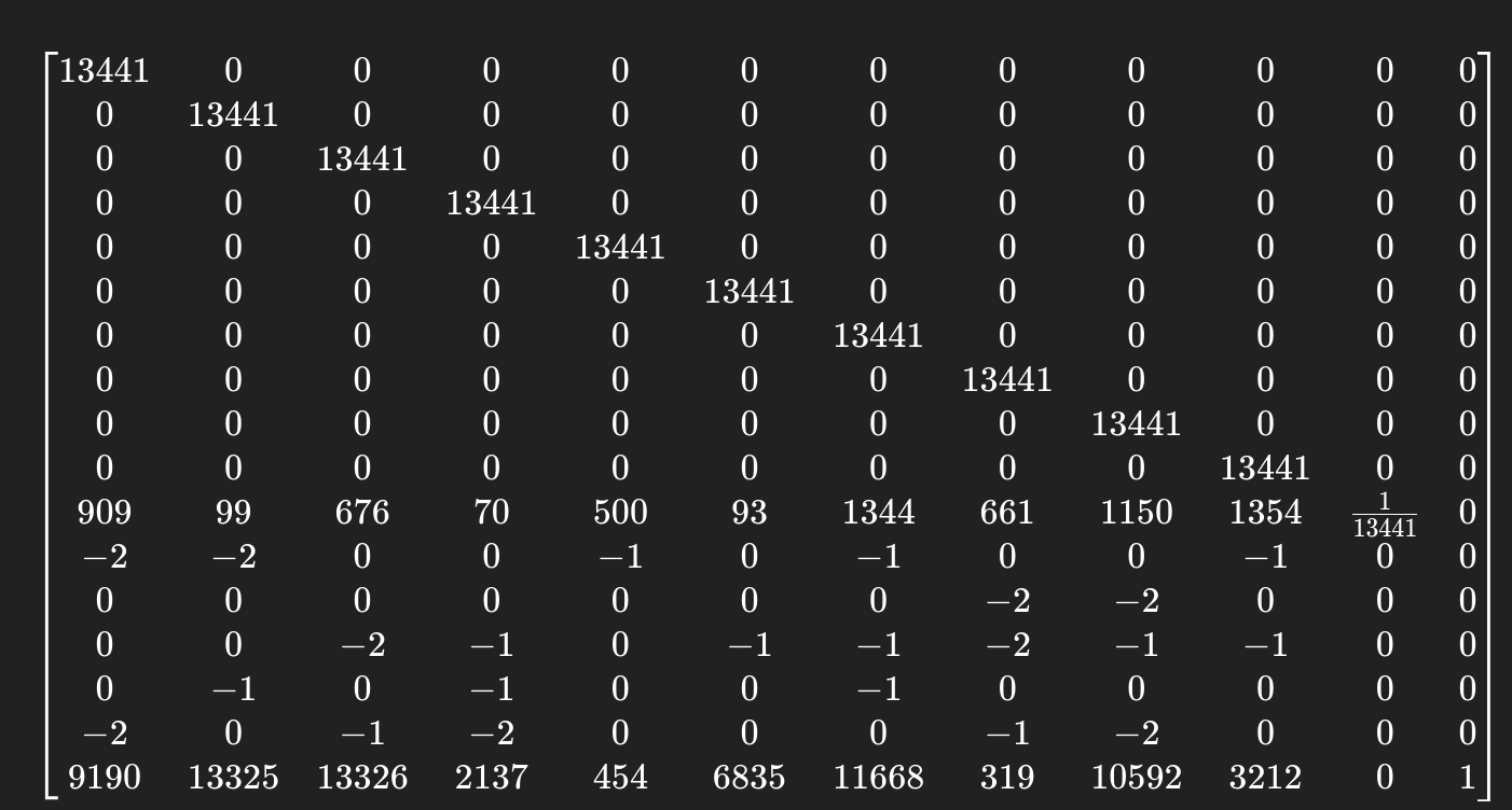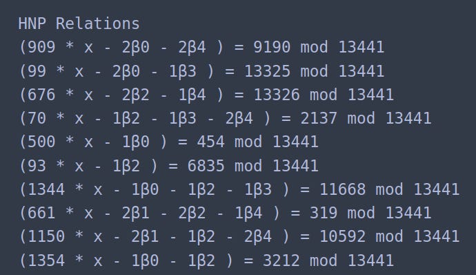 Sanity Check: Observe that the matrix product xB, where B is the HNP-CE lattice from Step 3, generates these linear combinations, and we expect our secret x to appear at the 11th column: