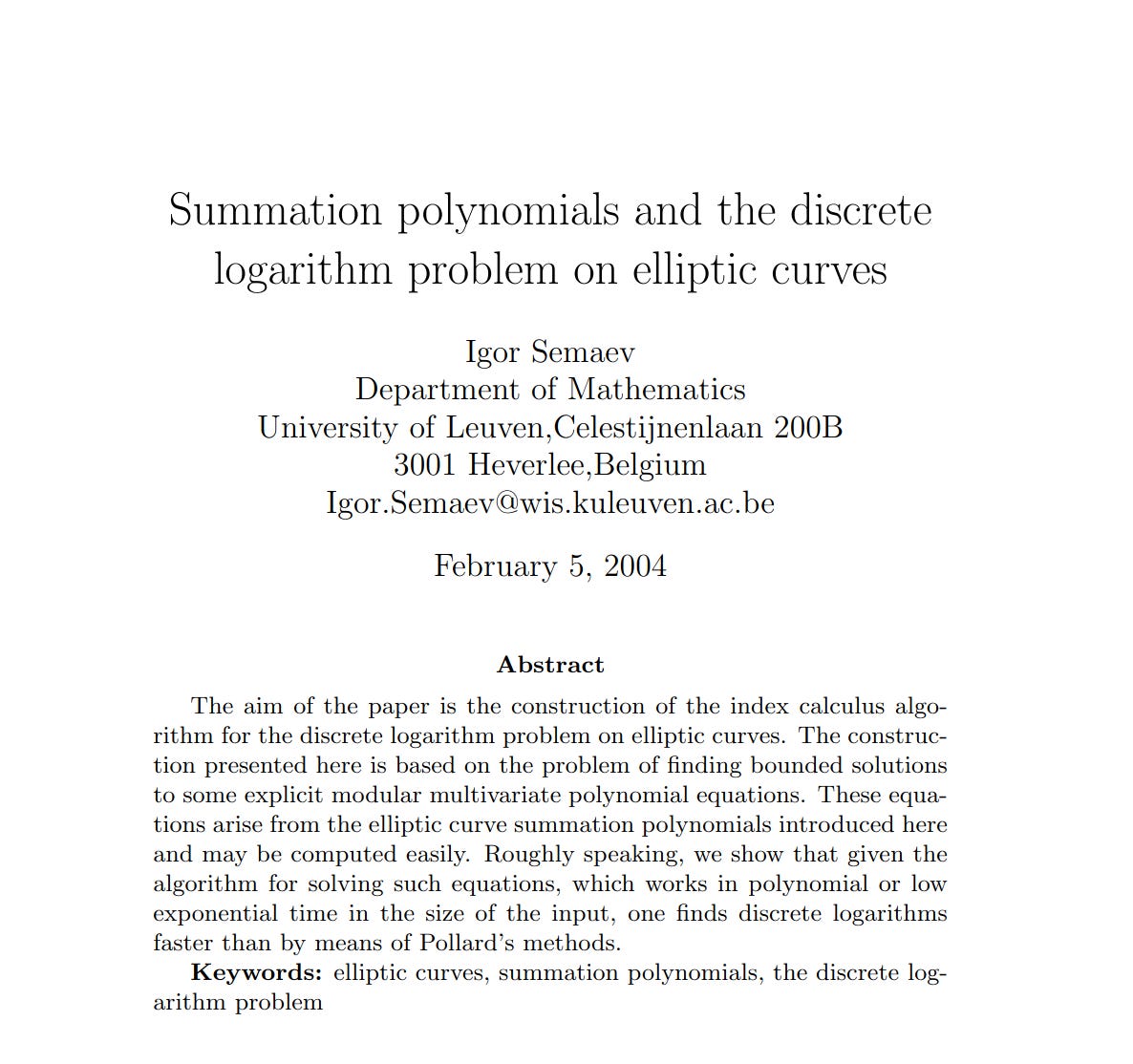 The paper Summation Polynomials and the Discrete Logarithm Problem on Elliptic Curves (Semaev, 2004)8 introduced the idea of index calculus on an elliptic curve over a prime finite field.