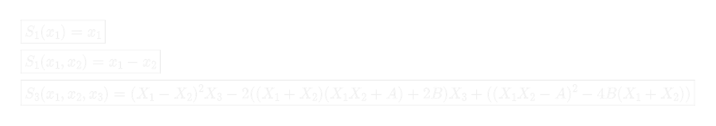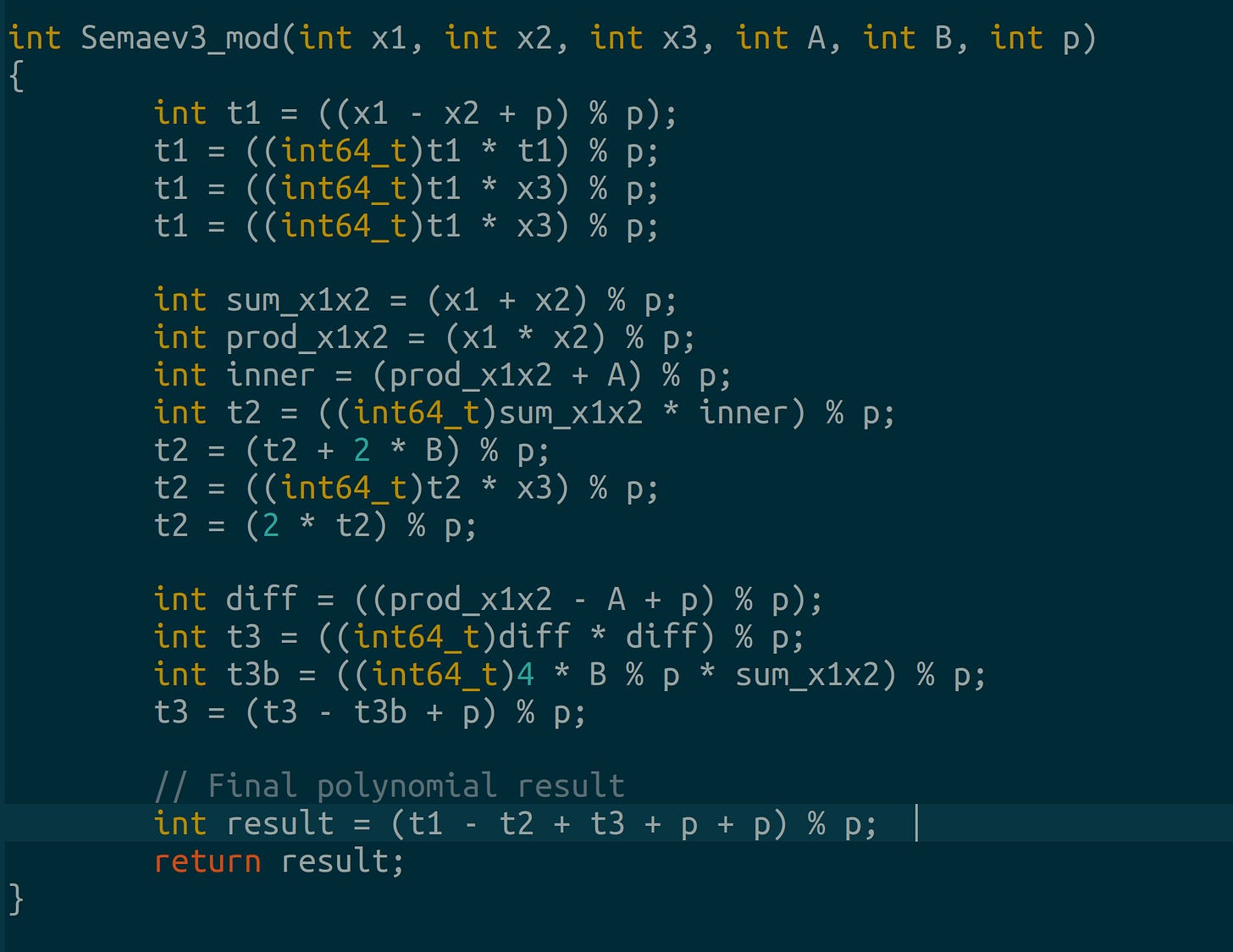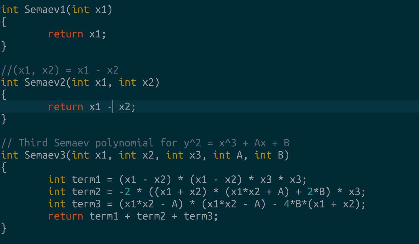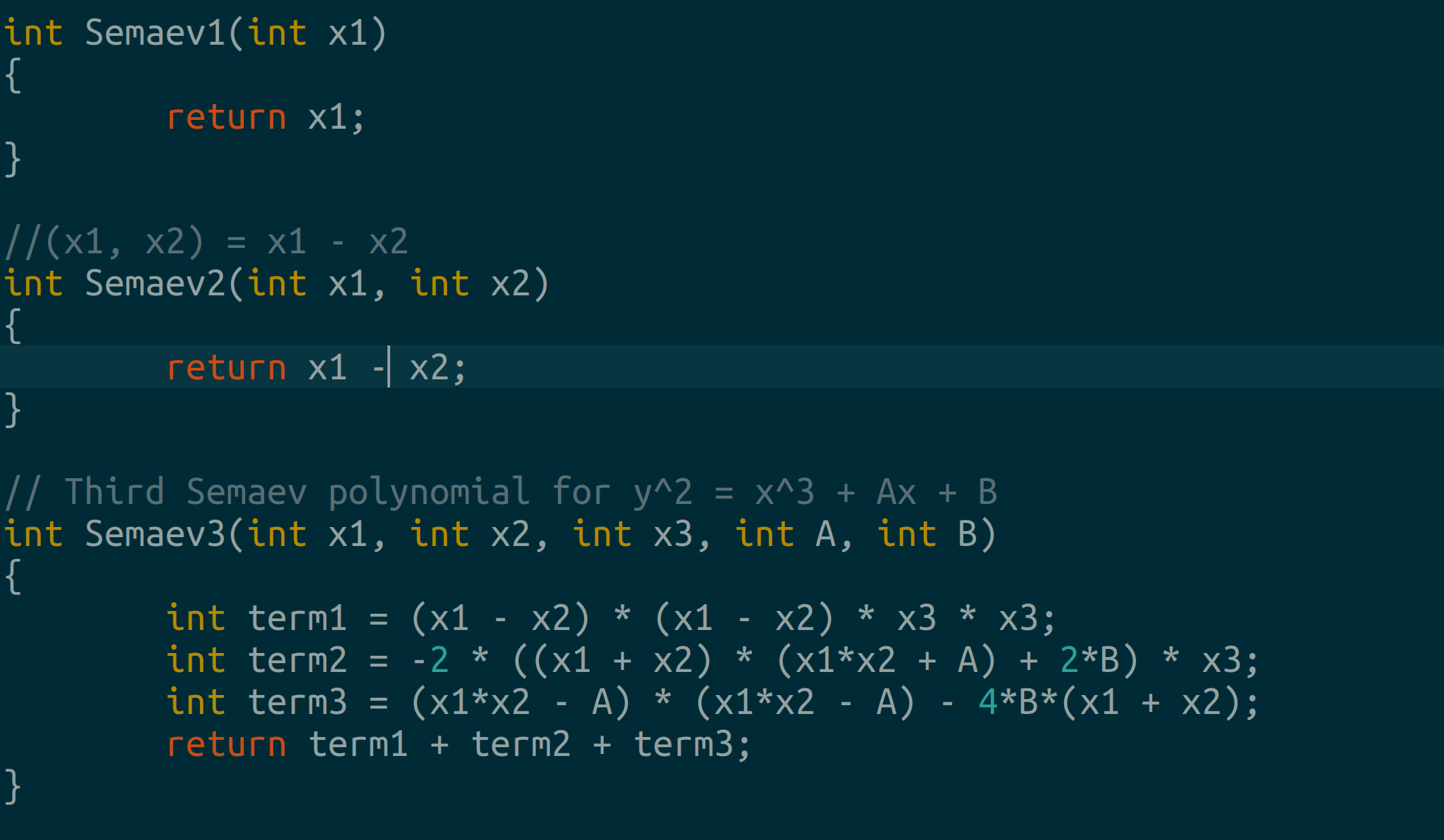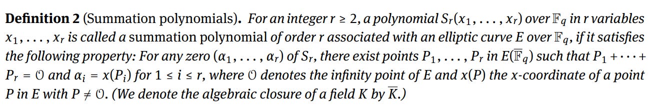 More formally, a Semaev summation polynomial is a symmetric, recursive polynomial defined over the elliptic curve points (xi,yi)∈ E(𝔽p) that displays the property fn(x1, x2,...,xn) = 0 and (x1,y1) + (x2,y2) + ... + (xn,yn) = P∞ (Semaev, 2004)