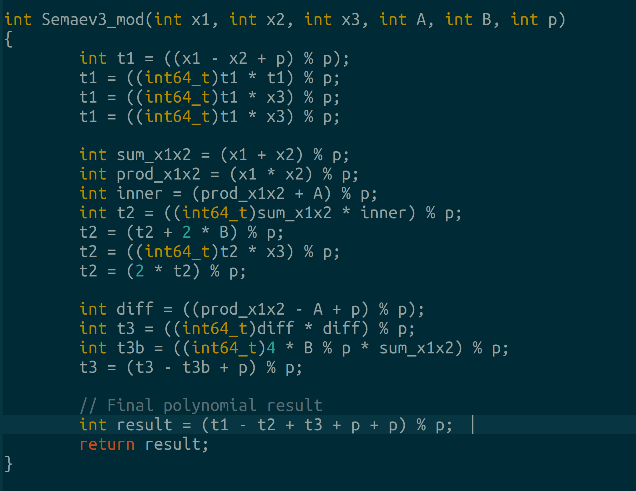 x, L = solve_two_variables_system(coeffs1, coeffs2, n)x is our target. From the C code, our target point indeed had a value of 19691. It worked!