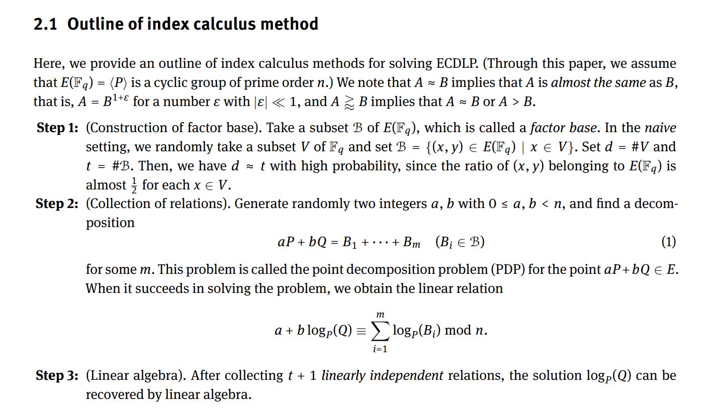 We’ve tackled index calculus over integer fields and algebraic rings. Now it’s index calculus over elliptic curve points lol.