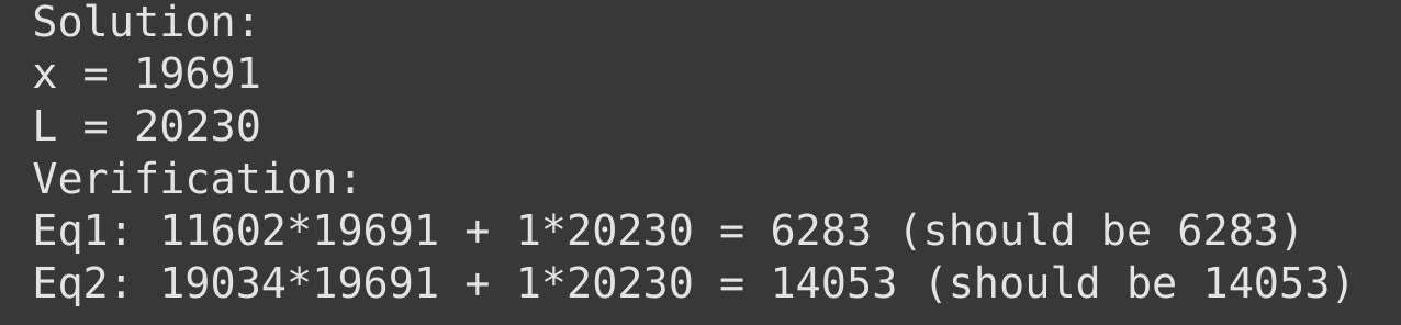 print(f”Eq1: {a1}*{x} + {b1}*{L} = {eq1} (should be {c1})”)