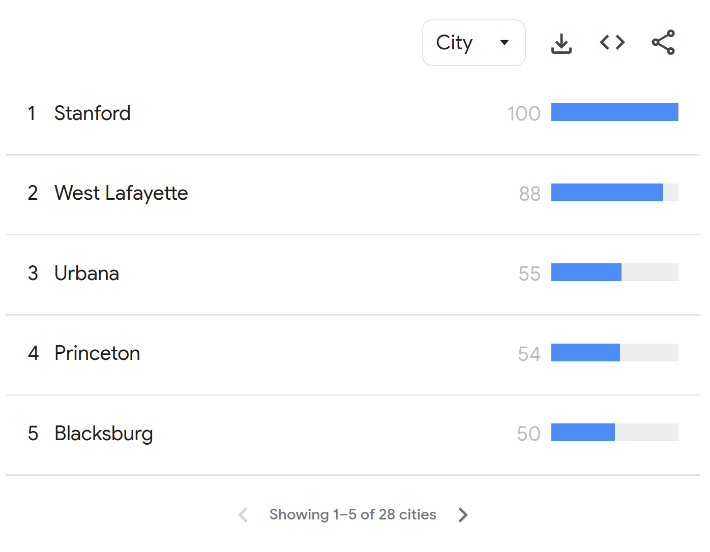 Here’s where it gets interesting. Stanford (the place where all the tech bros attend) displays the highest popularity when ranked by city.