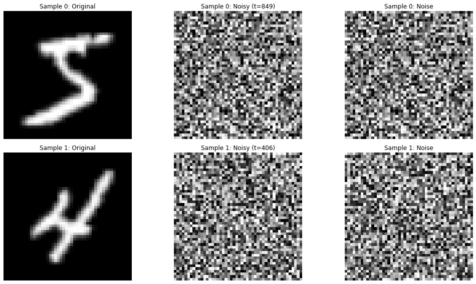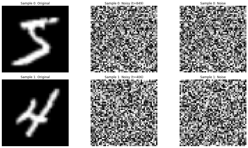 titlesSample0 = [’Original’, f’Noisy (t={batchT[0].item()})’, ‘Noise’]